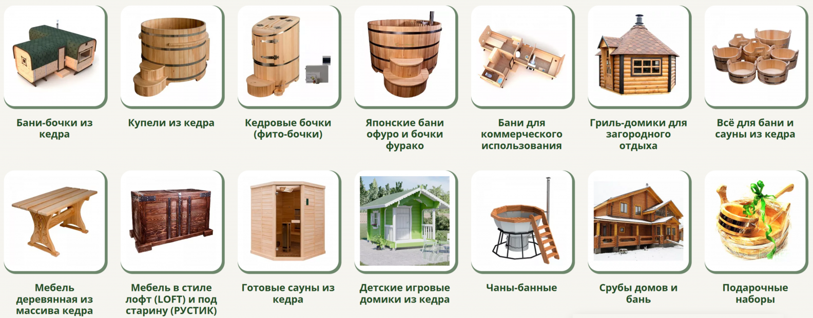 В ассортимент продукции, выпускаемой нашей компанией, также входят разные изделия из кедра: кедровые фито-бочки и купели, шайки и ушаты, запарники и черпаки, всё для бани и сауны, мебель для бани и сауны, мебель для дачи и сада, мебель для дома по индивидуальным размерам, и даже мебель под старину - создающую удивительную атмосферу гостеприимного русского дома. У нас Вы можете приобрести товары для домашнего обихода, например, кедровую посуду и кадки для засолки, надолго сохраняющие свежесть продуктов и обогащающие их целебными бальзамическими свойствами.