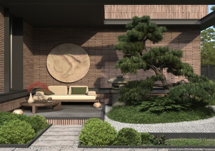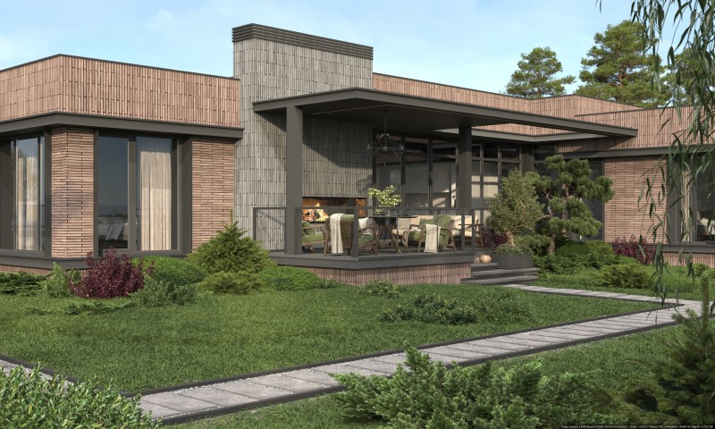 Дом сочетает в себе строгие геометрические формы с элементами природной эстетики. Просторные панорамные окна обеспечивают естественное освещение и визуальную связь с окружающим ландшафтом. Он идеально подходит для комфортной жизни, объединяя современный дизайн и функциональность.