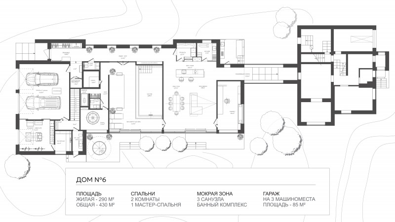 Дом включает спа-комплекс с бассейном, хамамом и просторной зоной для отдыха. Ключевой особенностью этого проекта является многоскатная крыша, которая позволяет играть с высотами, создавая интересное внутреннее пространство и выделяя основные функциональные зоны.