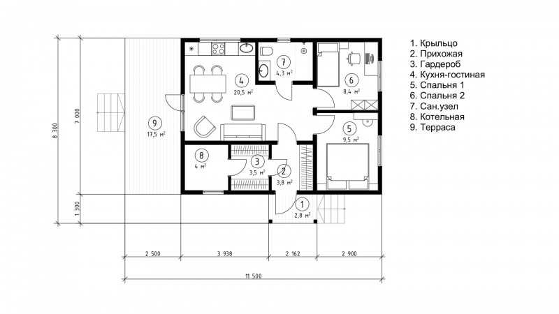 Компактный дом, есть все необходимое: две спальных комнаты, просторная кухня с зоной ТВ, сан.узел и гардеробная. Терраса 17.5 м.кв.