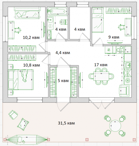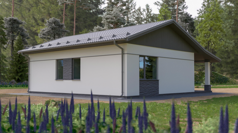 Кровля в варианте проекта 73 м2: кровля 4х скатная с отделкой из металлочерепицы, утеплитель насыпная мин вата, пароизоляция и ветрозащита. Водостоками и снегозадержателями комплектуется по дополнительному соглашению с клиентом. Подшив свесов кровли, осуществляется софитами. Балка муэрлата:100х150 мм, стропила и балки перекрытия 50х200 мм, обрешетка верхняя 32мм (через ряд, в местах повышенного скопления снега у конька и перед свесом обрешетка укладывается сплошным слоем.) Внутренняя обрешетка укладывается через 2 доски с последующим крепление для ГКЛ листов влагостойких.