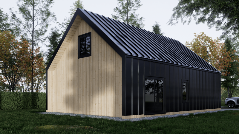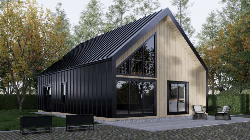 Прекрасный дом в Скандинавском стиле площадью 149м2. Этот дом является истинным фаворитом наших клиентов. Оригинальная форма крыши зонирует дом на 2 части – с высоким потолком зона отдыха в кухне-гостиной, с низким – спальный блок.