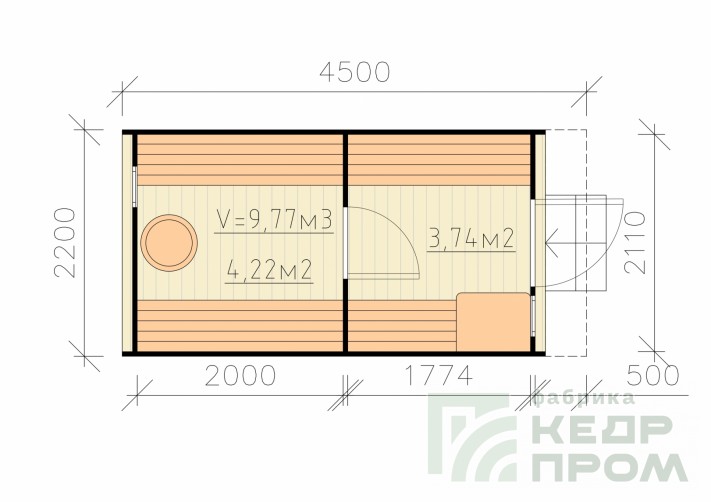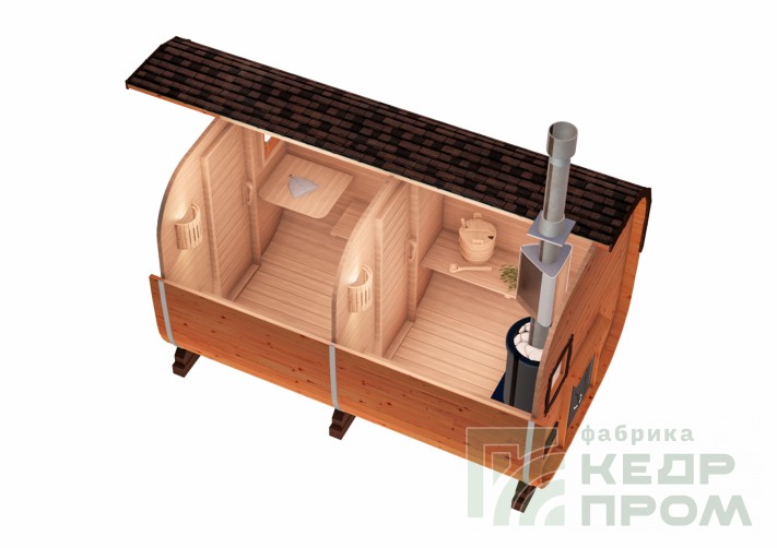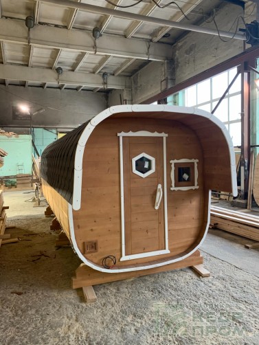 Модель бани-бочки длиной 4,5 метра с козырьком над входом. Внутреннее оснащение бани одинаковое, как у аналогичной 4-х метровой, за исключением козырька, который защищает от дождя и солнца, так же добавляет колорит во внешний вид бани. Одна из самых популярных изделий в нашем модельном ряду.