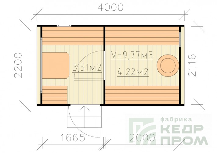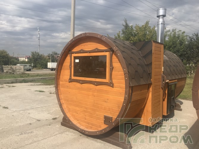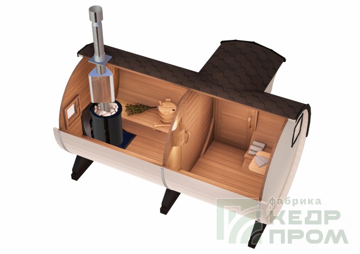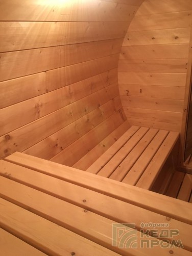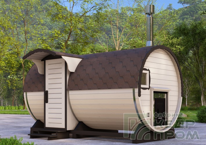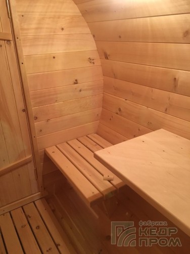 Баня-бочка классической круглой формы длиной 4 метра, но отличительной особенностью является вход с боковой стороны, что во многих случаях благоустройства участков и невозможности сделать вход с другой стороны. При этом внутреннее пространство бани не менее удобно, и даже наоборот более комфортное расположение стола и полков.