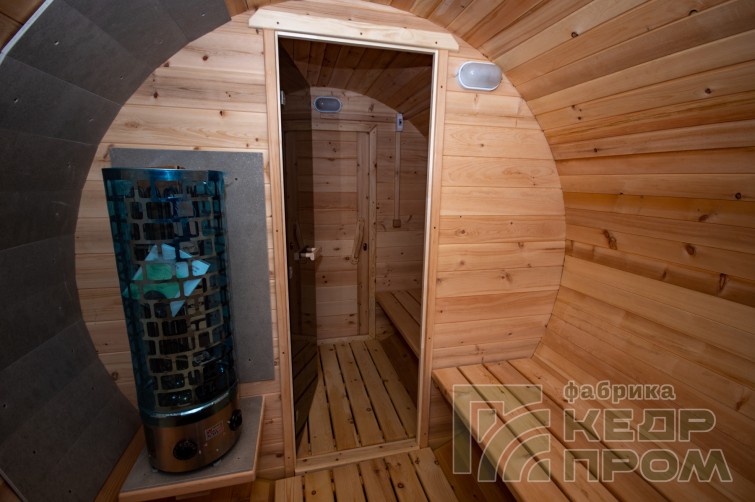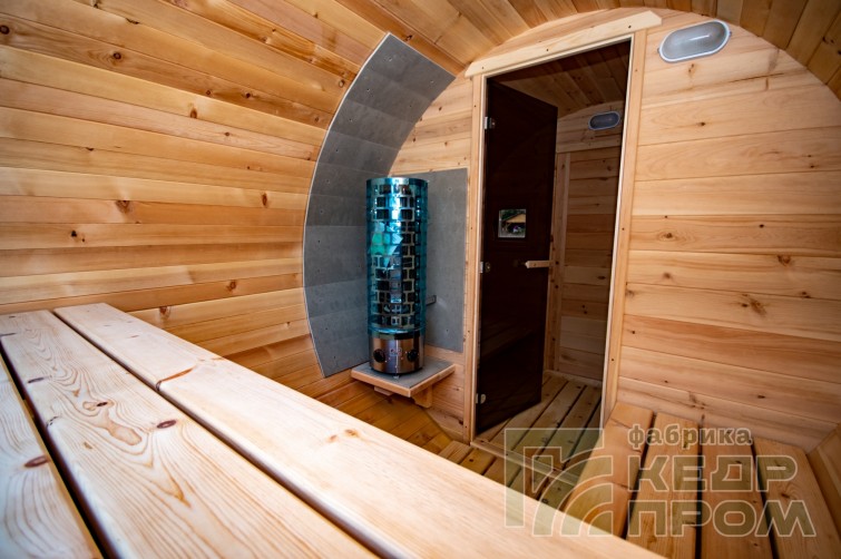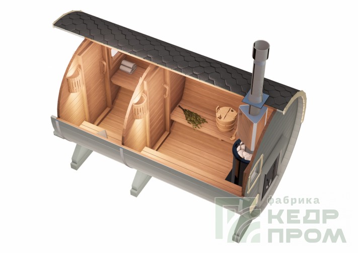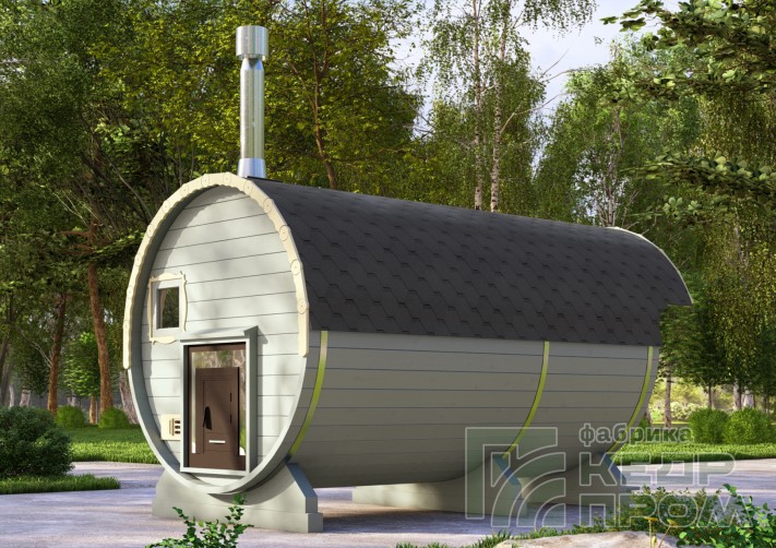 Баня-бочка длиной 4 метра с козырьком над входом, увеличенная длина бани позволяет разместить не только вместительную парную, но и комфортабельную раздевалку или комнату отдыха, в которой комфортно может находиться несколько человек. Одна самых популярных моделей в нашем ассортименте бань.