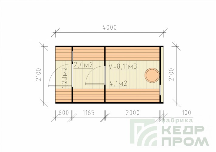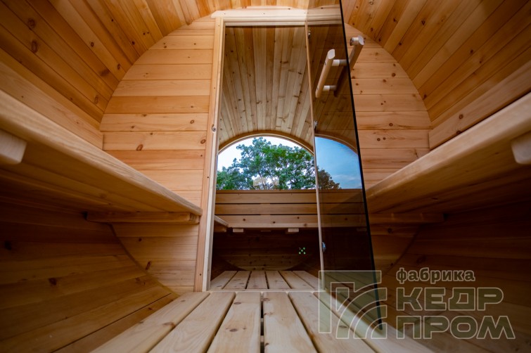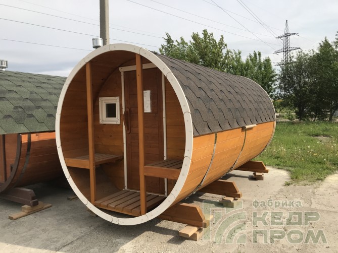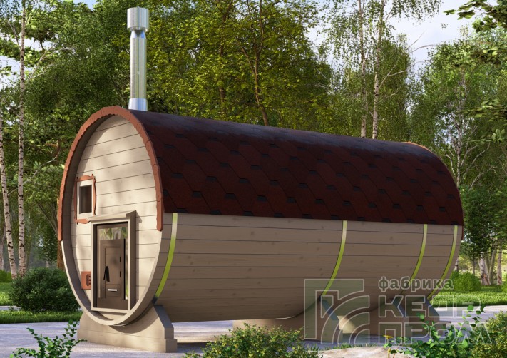 Баня-бочка квадратная длиной 4 метра с верандой. Баня имеет два отделения – парная и комната отдыха, а также открытую веранду или крыльцо с двумя сидениями. Комната отдыха у этой модели чуть меньше за счет добавления веранды, но парная полноценная и большая. Все остальное в комплекте: печь с камнями, бак для горячей воды, полки, трапики, окна.