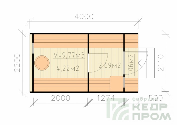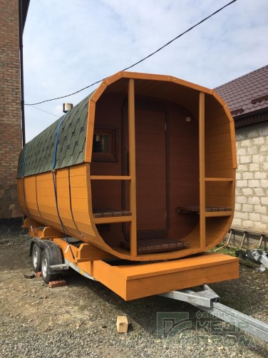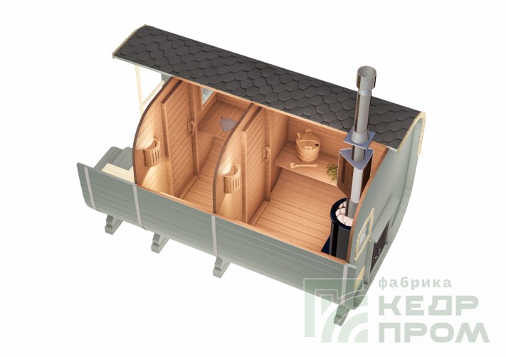 Баня бочка 4 метра длиной с верандой, или можно так сказать с крыльцом. По оснащению и комплектации аналогична предыдущим моделям такой же длины, за исключением изменения внутреннего размера комнаты отдыха, она стала чуть меньше, но зато появилось крылечко с двумя сидениями, где можно посидеть на свежем воздухе после жаркой бани.