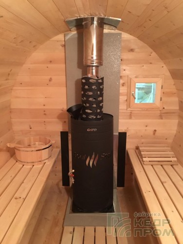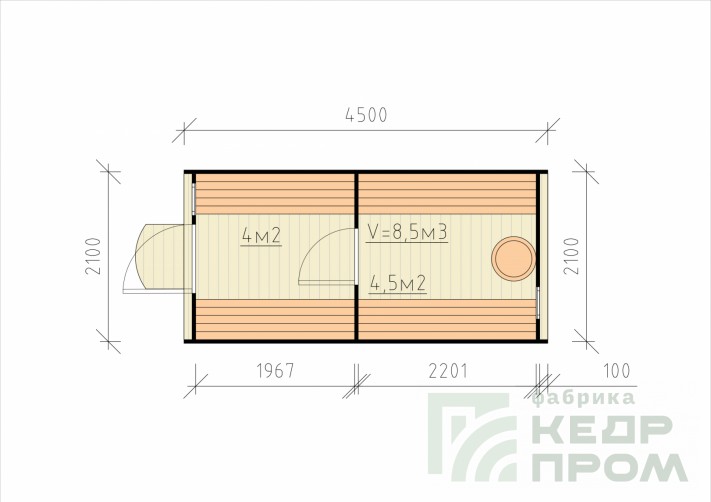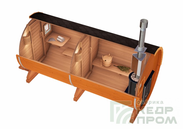 Банька в виде бочки круглая длиной 4,5 метра, отличительная особенность модели такой длины, это увеличенная комната отдыха или, так называемый, предбанник, который имеет внутренний размер 2 метра, и просторная парная 2,2 метра. Баня имеет два отделения, парная и комната отдыха, парная предполагается совестно с мойкой.