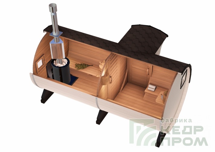 Круглая баня-бочка длиной 4,5 метра с входом сбоку. Данная модель бани будет удобна в первую очередь расположением и планировки и застройки участка таким образом, что вход возможен только с передней стороны фасада. А также внутреннее пространство может показаться более удобным и комфортным в сравнении с классическим входом с торца.