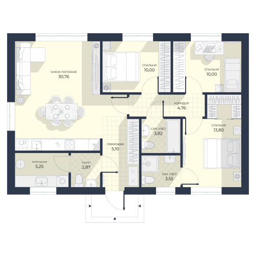 Идеальный дом с четырьмя комнатами. Высокие потолки и большие окна делают пространство светлым и воздушным!