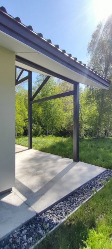 Дом функционально разделен на зоны кухни-гостиной, спального блока «детские» и спального блока «мастер спальни». Кухня-гостиная расположена в середине дома. Парковка для авто выполнена под навесом, рядом с главным входом в дом. Терраса находится под одной крышей с домом. Дом сдается в отделке white box. Гипсовая штукатурка Knauf под обои.