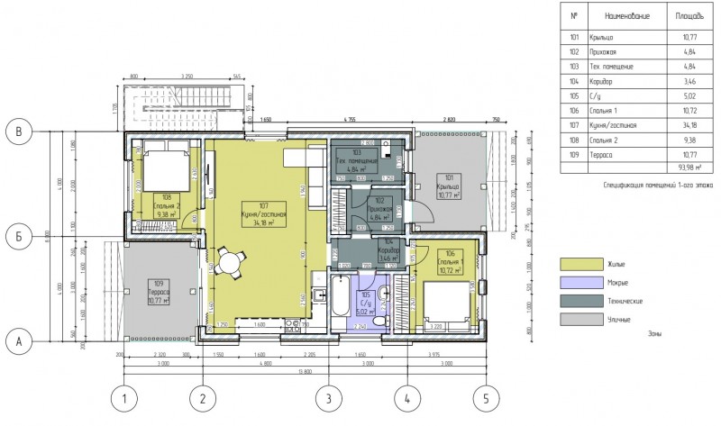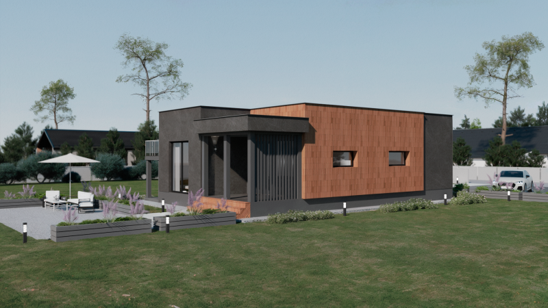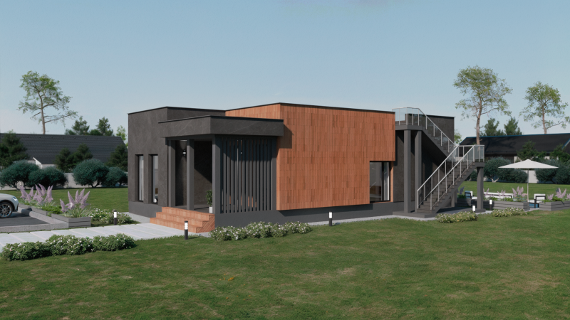 Деревянный одноэтажный дом с эксплуатируемой крышей из 7 модулей. 2 террасы- по 11 м2. Панормное остекление. Внутренняя отделка white box. Лестница на крышу снаружи дома. Есть тех. помещение. Стильный дом для современной семьи, которая ценит комфорт и эргономику.
