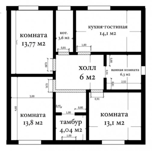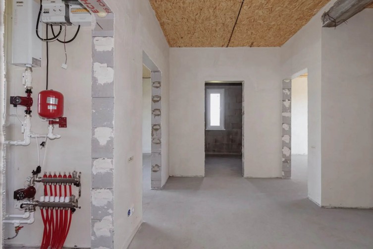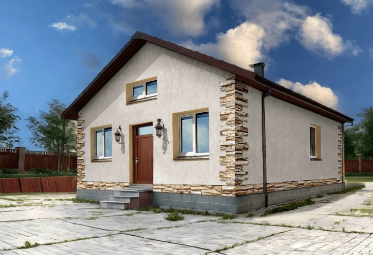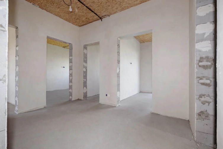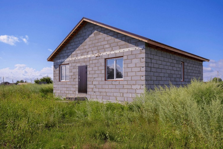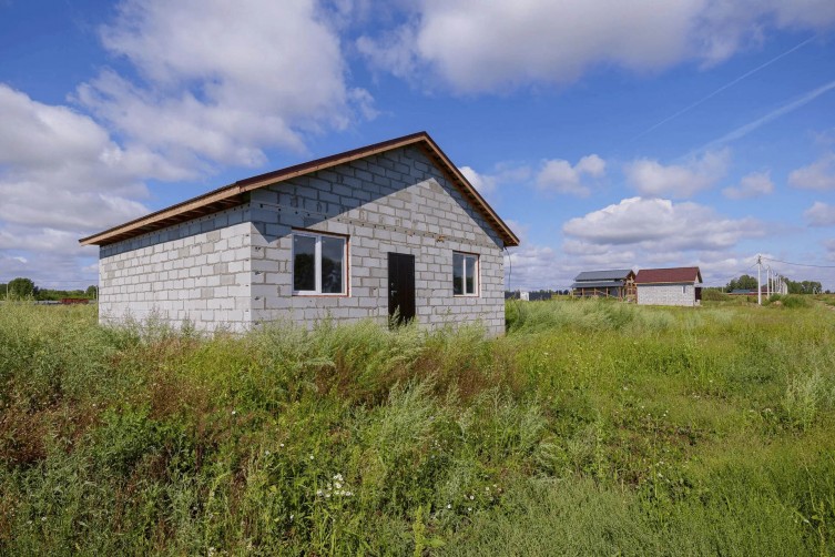 Одноэтажный жилой дом без внешней отделки. Предусмотрены 3 жилые комнаты и просторная кухня-гостинная.