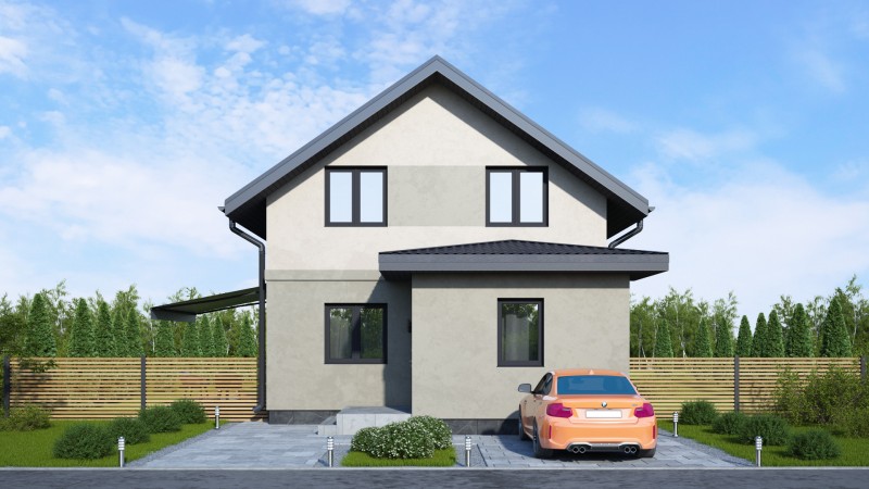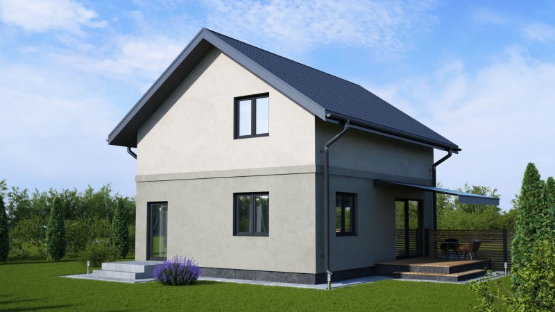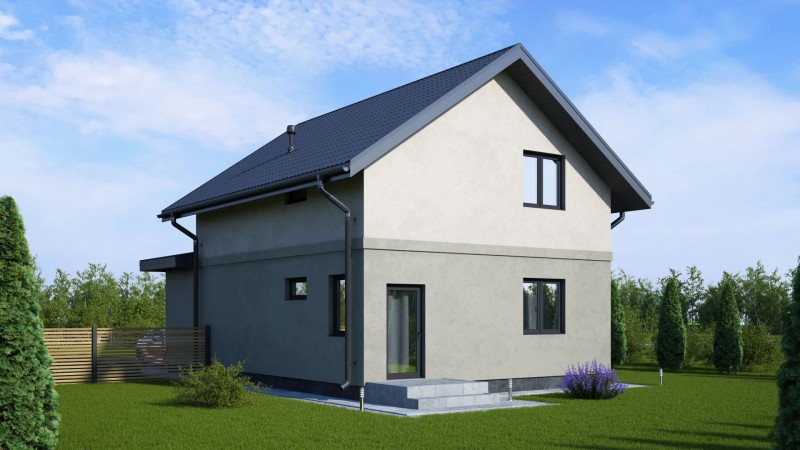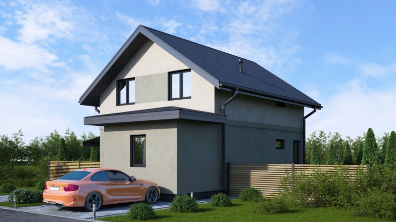 Компактный двухэтажный дом с оригинальными комбинированными фасадами выполненными декоративной штукатуркой, двухскатной практичной кровлей. Имеет четыре спальни, кухню гостиную, котельную, постирочную, второй санузел, вместительный теплый тамбур, удобное кладовое помещение с отдельным выходом на задний двор.