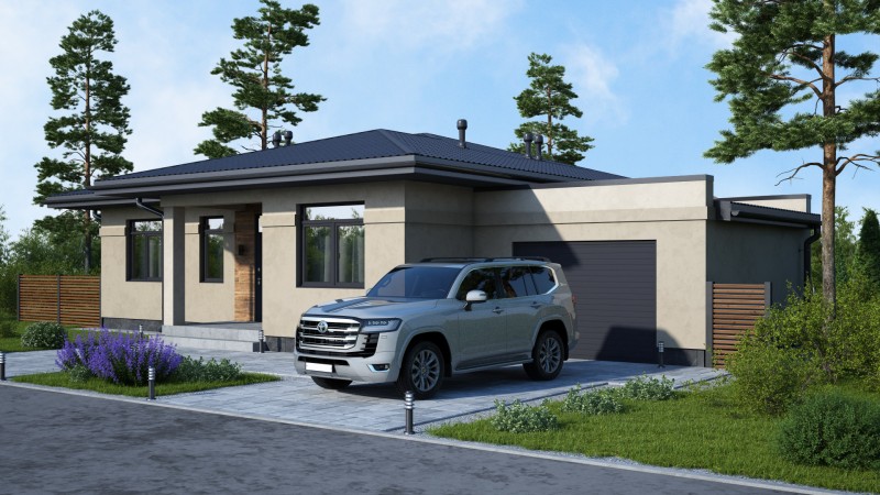 Красивый большой одноэтажный дом с оригинальными комбинированными фасадами, интересной кровлей и гаражом. Имеет три спальни, одна из них мастер спальня с гардеробной и санузлом, просторную кухню гостиную с выходом на террасу, котельную-постирочную, второй санузел, закрытое от осадков крыльцо и просторную террасу, гараж на один авто.