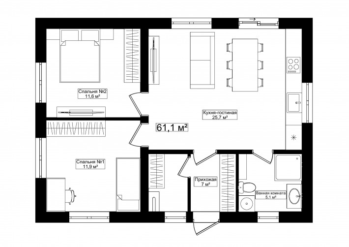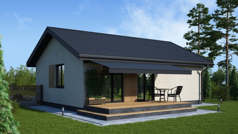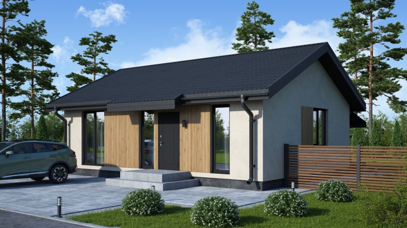 Компактный функциональный одноэтажный дом с оригинальным фасадом и двухскатной кровлей. Имеет две спальни, кухню гостиную с выходом на задний двор, котельную-постирочную, второй санузел можно разместить в котельной постирочной.
