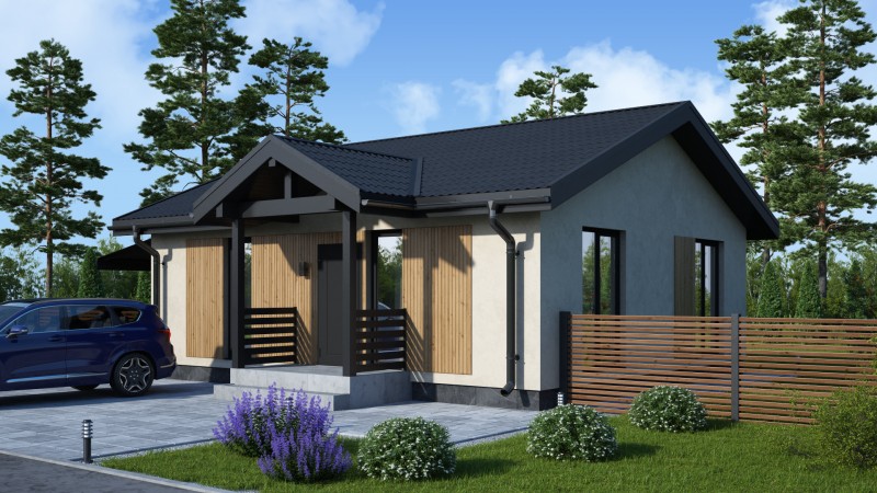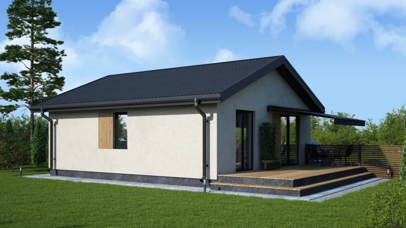 Компактный функциональный одноэтажный дом с оригинальным фасадом и двухскатной кровлей. Имеет 2 планировки две спальни или 3 спальни, кухню гостиную с выходом на террасу, котельную-постирочную, в которой можно разместить второй санузел.