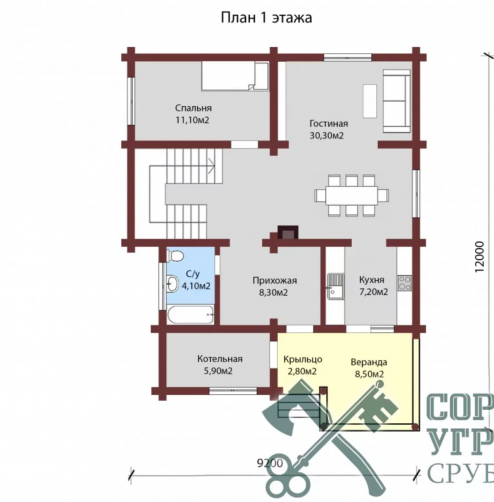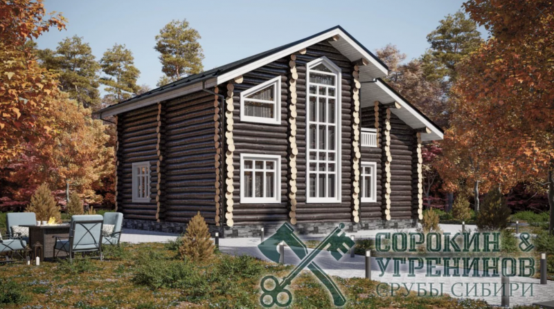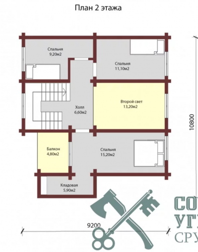 Проект дома из бревна диаметром 260мм, площадь дома 152м2. Размер сруба 9,2х12 метров. Первый этаж имеет прихожую, котельную, санузел, гостиную, кухню. На втором этаже три комнаты, второй свет, есть балкон и холл.