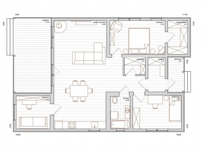 Пространство дома объединяет кухню и гостиную, есть две большие спальная комнаты, просторный кабинет.
