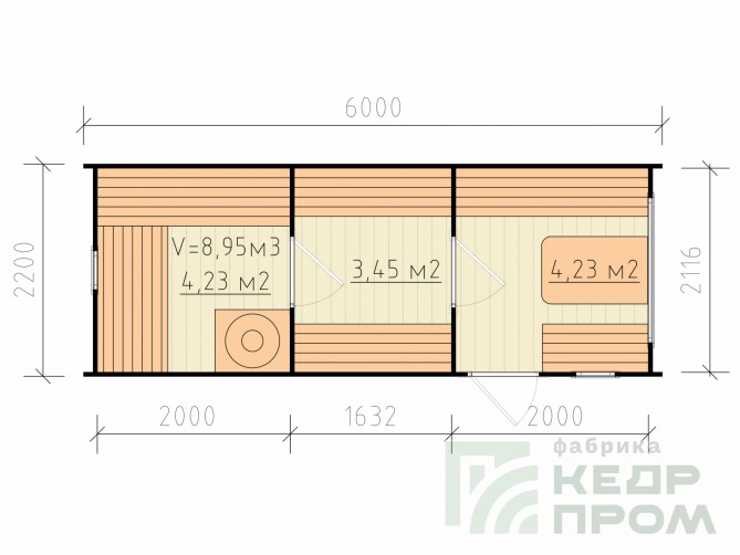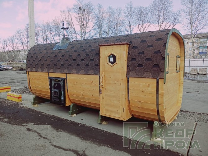 Квадратная 6-ти метровая баня-бочка из древесины кедра с боковым входом – максимум комфорта! Квадратная форма бани-бочки с закруглёнными углами придаёт необычный вид и увеличивает пространство внутри. Боковой вход в тамбур разделяющий парную от комнаты отдыха.