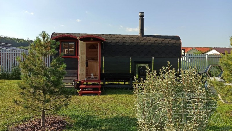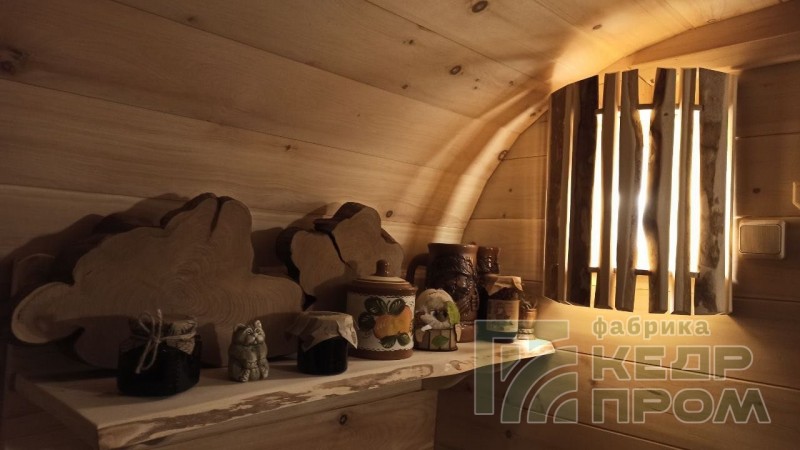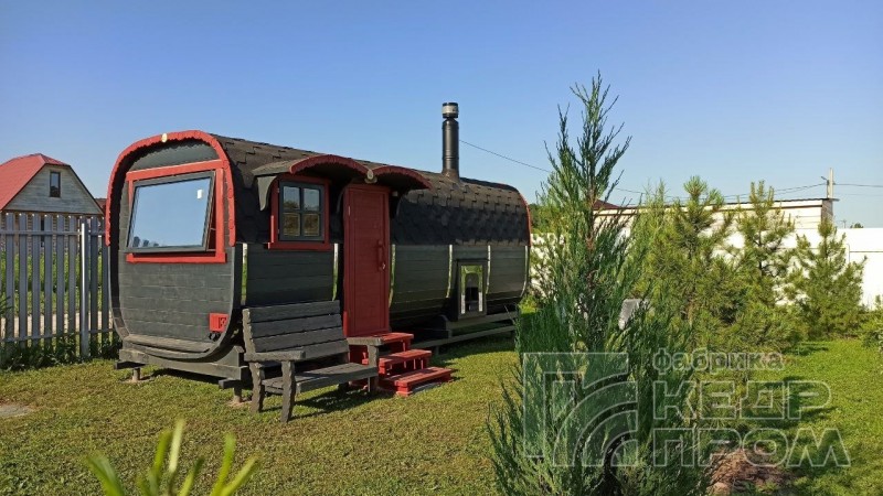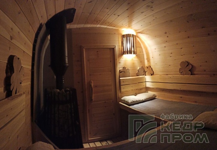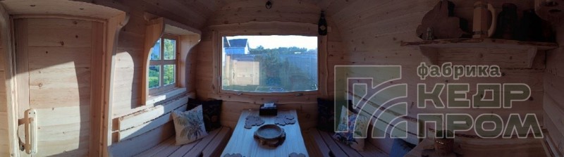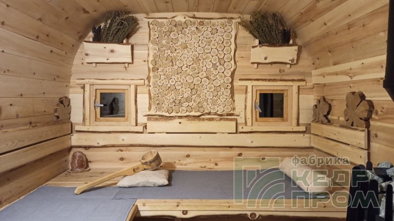 Квадратная 6-ти метровая баня-бочка из древесины кедра с боковым входом – максимум комфорта! Квадратная форма бани-бочки с закруглёнными углами придаёт необычный вид и увеличивает пространство внутри. Боковой вход в тамбур разделяющий парную от комнаты отдыха.