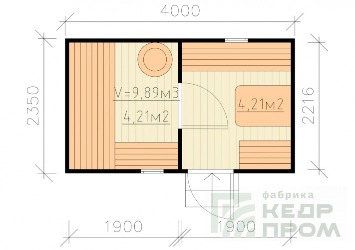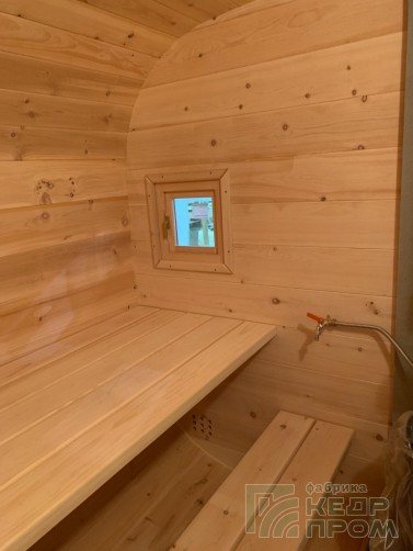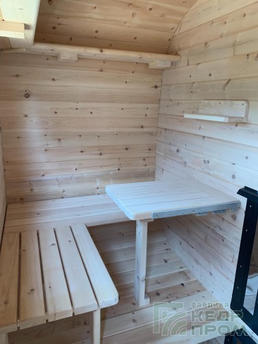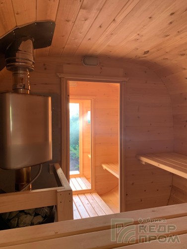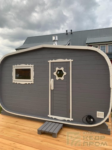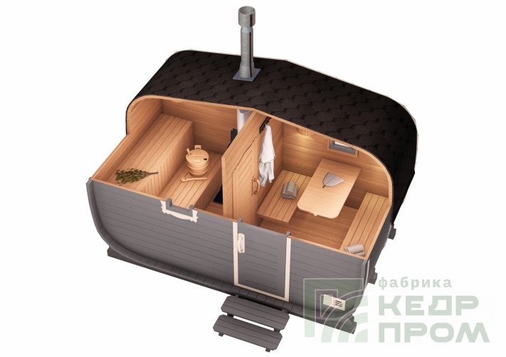 Квадро-овальная банька длиной 4 метра и шириной 2,35 метра. Отличается, в первую очередь, оригинальным внешним видом. Внутреннее оснащение бани - это просторная парная и комната отдыха, в которых имеется всё: печь в комплекте с дымоходом, удобные полки, трапики, стол, сидения, окна, и даже камни для печи, докупать ничего не нужно.