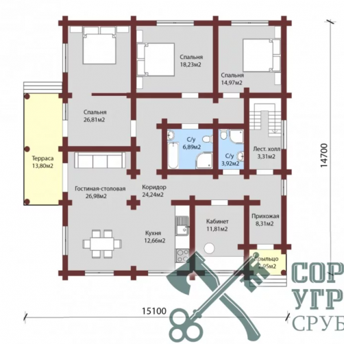 Возможно изменить технологию рубки сруба, наши мастера владеют всеми видами плотницких инструментов и соединений. Канадская рубка, Норвежская рубка, Post&Beam, все виды русских чашек и углов, (охлоп, обло, курдюк, седло, лапа), а так, же совмещенная технология, внутренние стены в виде лафета (облафеченные), а снаружи остается бревно. Выполняем все виды работ плотницких и столярных по всей России и за ее пределами.