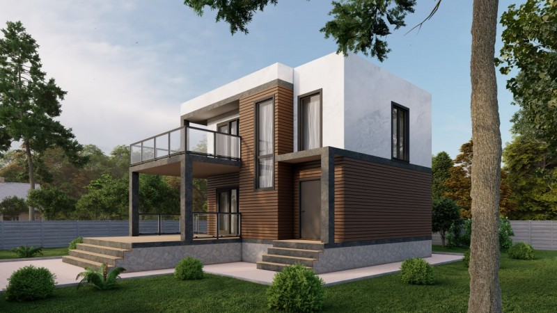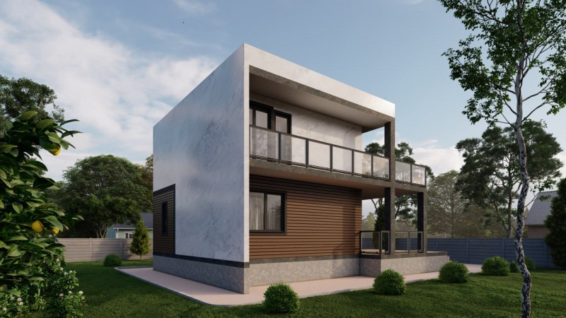 Проект Артемида – это оригинальный СИП дом в стиле хай-тек, двухэтажный, с просторными террасой и балконом, а также плоской крышей.