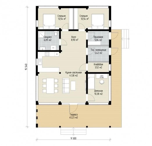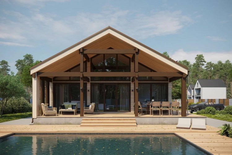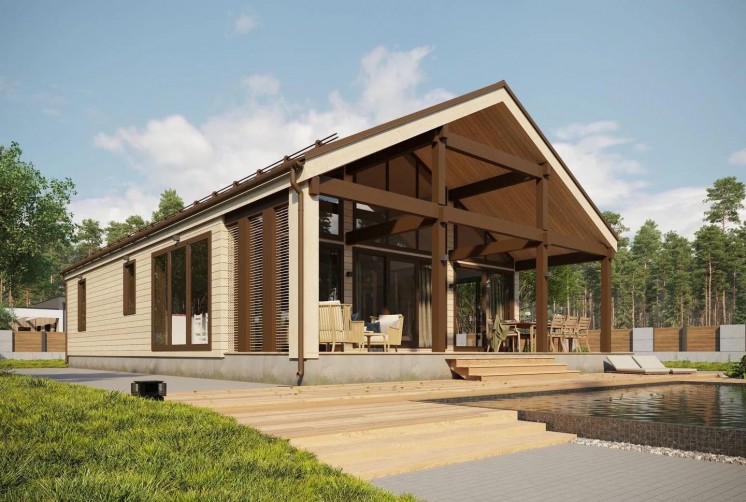 Один из примеров такого дома – одноэтажный дом по проекту Barn. Он отличается своей планировкой, которая включает в себя кухню-гостиную, три вместительных спальни, санузел, техническое помещение и просторную террасу. Большие окна, пропускающие много света, делают дом очень энергоэффективным, а также придают ему современный вид.