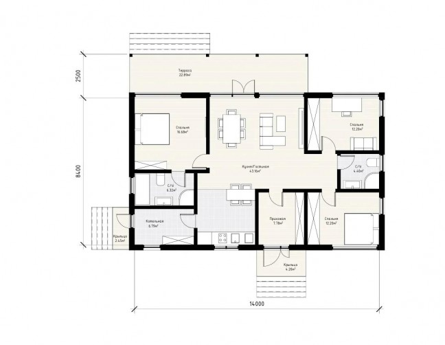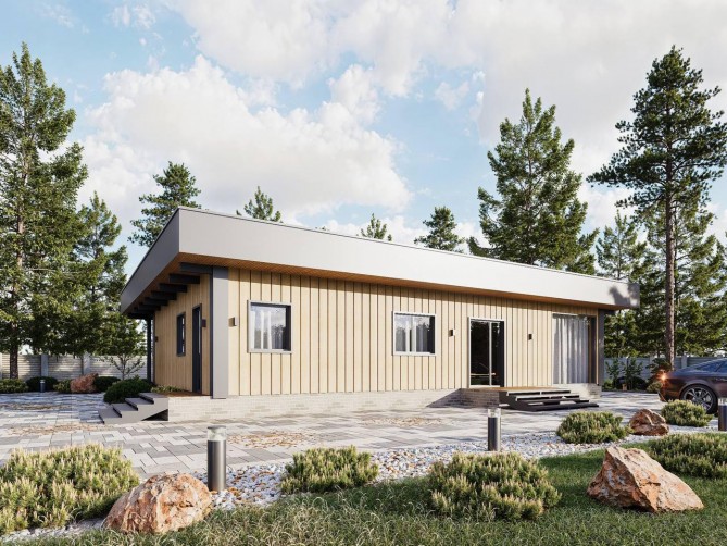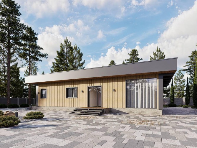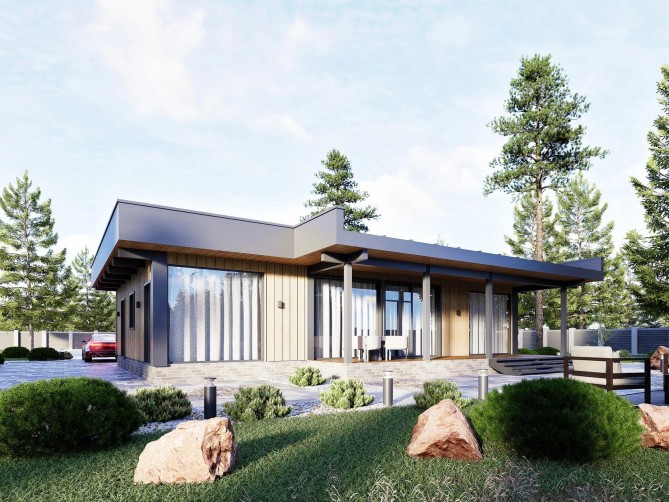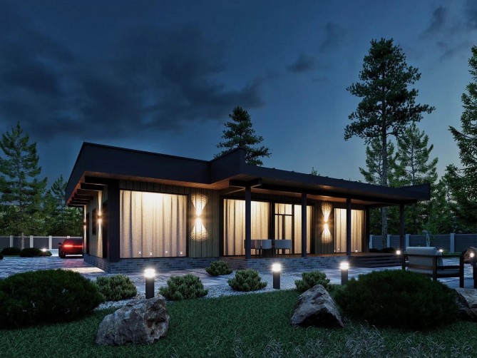 Дом FLAT — это просторный и красивый одноэтажный дом в современном стиле с высокими потолками и панорамным остеклением во всех комнатах.