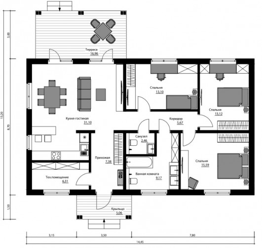 Большой и светлый каркасный дом площадью 124 м2, созданный для комфортной жизни. Вас встретит стильная прихожая, ведущая в уютную гостиную с панорамным освещением, где можно собраться за чашкой чая или принять гостей. Современная кухня, объединенная с гостиной, станет сердцем дома, где рождаются кулинарные шедевры и теплые воспоминания. В доме три уютные спальни, каждая из которых — это личное пространство для отдыха, два санузла подчеркивают практичность дома, а просторная терраса станет идеальным местом для утреннего кофе или вечерних посиделок на свежем воздухе. Для хранения и размещения инженерных предусмотрено техническое помещение.