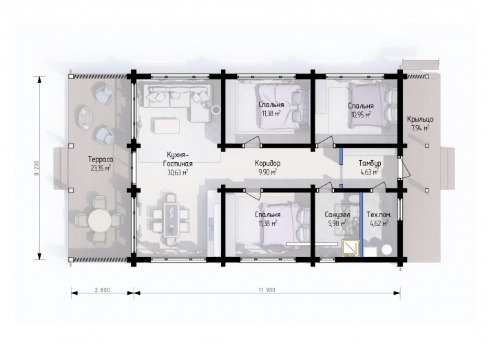 Этот одноэтажный дом площадью 106 м² станет идеальным местом для постоянного проживания или отдыха. Такой дом рассчитан на семью из четырёх человек и предлагает комфортную планировку: три уютные спальни, просторную кухню-гостиную с панорамными окнами, где светлый день будет наполнять каждый уголок вашего дома теплом и светом. Просторная терраса подарит близость к природе, наполнит дом светом и свежестью, а по вечерам будет превращаться в тёплое место для всей семьи, где воздух оживает разговорами и теплом воспоминаний.