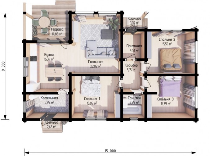 Представляем вашему вниманию уютный одноэтажный дом из клееного бруса — идеальное воплощение тепла и комфорта для семьи. Светлые фасады и просторная терраса приглашают вас наслаждаться каждым моментом в гармонии с природой. Внутри — продуманная планировка: просторная гостиная, уютная кухня-столовая и три комфортабельные спальни для всей семьи. Одну комнату можно заменить и сделать кабинет или детскую игровую — это ваша зона для творчества и работы. Современный дизайн с большими окнами наполняет дом светом и теплом, создавая атмосферу уюта. Клееный брус гарантирует долговечность, экологичность и идеальный микроклимат круглый год. Небольшой, но функциональный дом — это не просто жильё, а ваш личный оазис спокойствия. Удобное расположение комнат обеспечивает максимальную приватность и комфорт для каждого члена семьи.