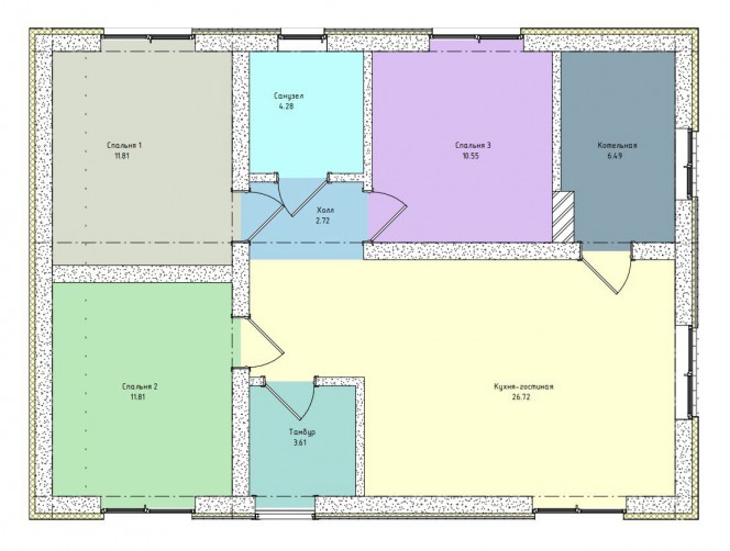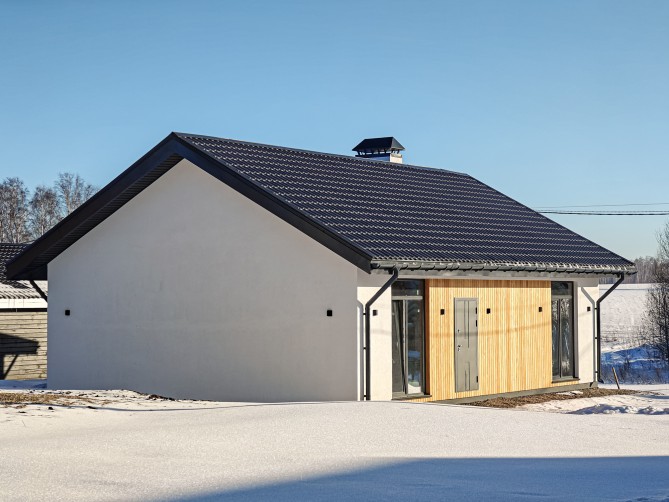 Лаконичный, экономичный дом обладает внутренней простотой. Планировкой предусмотрены просторная кухня-гостиная, три спальни, санузел и котельная. Комнаты квадратной формы позволяют наиболее эффективно использовать внутреннее пространство. Большие панорамные окна обеспечивают поток естественного света и красивый вид на окружающую природу. Этот дом — уютное и функциональное решение для тех, кто ценит практичность и простоту в деталях.