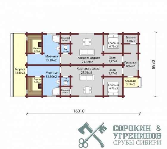 Проект банного комплекса на два номера, из бревна средним диаметром 260мм площадью 139,6м2. Размер сруба 8,9х16м метров по осям. Баня с верандой. Совмещенный вход и техническая комната, терраса. В каждой бане своя парная, мойка, санузел, большая гостиная комната, есть тамбур, и спальная комната. Объем бревна в срубе 120м3.