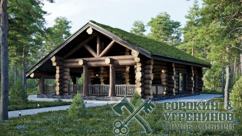 Эксклюзивный банный комплекс, сруб бани рубленый из бревна кедра большого диаметра 450мм, общей площадью 182,6м2. Размер сруба 9х15 метров по осям. Баня с мансардной крышей, и с антресолью. Просторная парная, помывочная, санузел, тамбур, гардеробная, комната отдыха и большая веранда, топочная с отдельным входом. зона барбекю. Баня проектировалась для базы отдыха санаторного типа, кровля на данном проекте была реализована живая, земляная с травой.