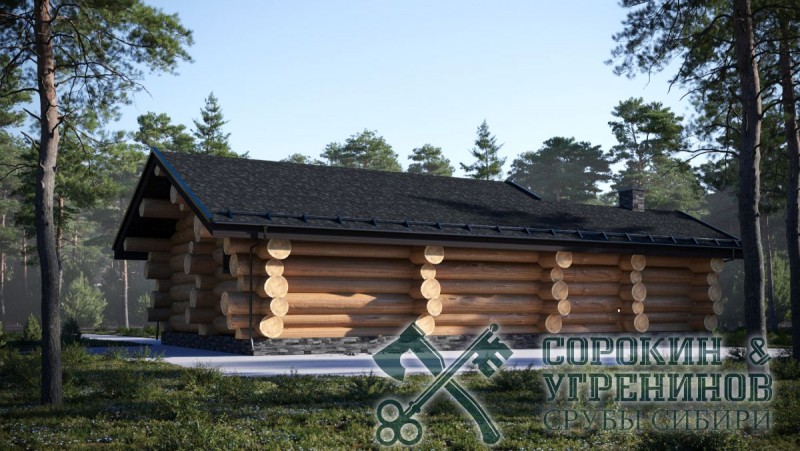 Сруб бани рубленый из большого бревна кедра диаметром 500мм площадью 81,62м2. Размер сруба 8Х15,5 метров по осям. Баня с террасой для барбекю. Парная, мойка, комната отдыха и сунузел. Сруб рубленый вручную (канадская рубка), брёвна окоренные гидро-окоркой (водой под высоким давлением), а так, же это можно сделать скобелем или лопатой, или строганное рубанком. Объем бревна в срубе 90м3.