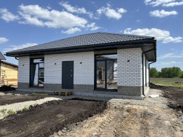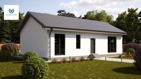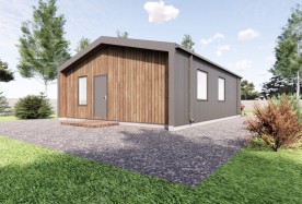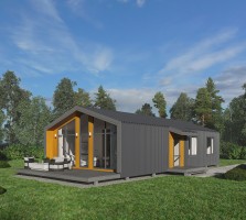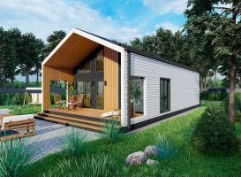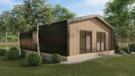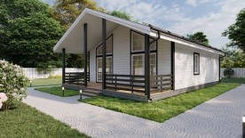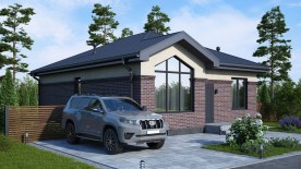 Проект загородного дома с баней внутри, рубленый из лафета сечением 250х400мм. Общая площадь дома 75м2. Одноэтажный дом имеет одну спальную комнату, есть просторная гостиная с кухней, парную с печью на дровах, душевая, и санузел, прихожая с гардеробом, и крыльцо.