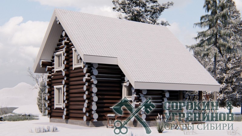 Проект дом-баня из бревна диаметром 320мм, площадь дома 80м2. Размер сруба 8х8 метров. На первом этаже баня, парная и мойка, и гостиная совмещенная с кухней, лестница на второй этаж, две спальные комнаты и небольшой холл. Проект планировался как временное жилье пока строится основной большой дом. Дом-баня установлен в 2010 году, в Новосибирской области в поселке Кудряшовский в живописном месте среди больших сосновых деревьев, на склоне с выходом к берегу реки Обь.