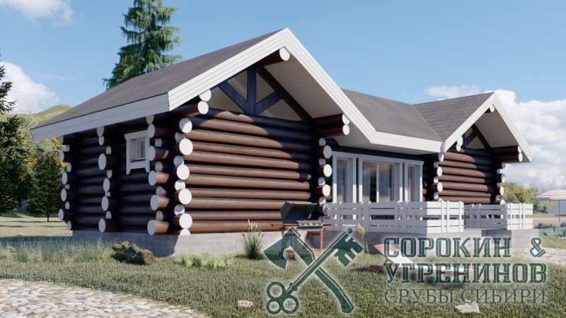 Проект дом-баня из бревна диаметром 300мм, площадь дома 82,9м2. Размер сруба 6,6х15,6 метров. Просторная парная разделена каркасной стеной между мойкой, есть спальная, санузел, гостиная, и терраса. Сруб смотрится красиво, три фасадные фронтона с элементами фермы в стиле post&beam придают строению отличный внешний вид, и второй свет внутри сруба.