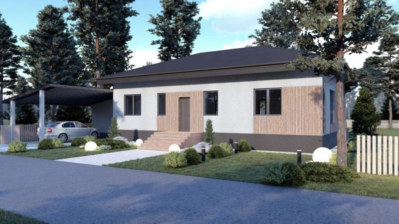 Рады представить нашу новинку — проект одноэтажного дома с мастер — спальней, оборудованной собственным с/у и гардеробной. Отличительной особенностью этого дома также являются французские окна с выходом на террасу из двух спален и кухни — гостиной, имеющей эргономичную форму, позволяющую визуально разделить зоны приготовления пищи, столовой и отдыха. В функциональной котельной помимо инженерного оборудования можно свободно разместить домашнюю прачечную, зону хранения и даже лапомойку для любимых питомцев. Фасад дома может быть выполнен как в классическом кирпиче, так и в штукатурке. Возможна зеркальная планировка. Глухая боковая стена позволяет в дальнейшем пристроить навес для автомобиля или гараж на 1-2 машиноместа.