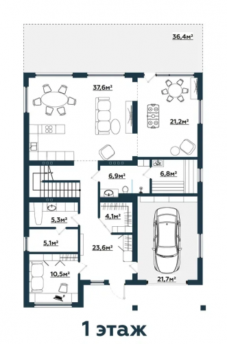 Просторная кухня-гостиная с панорамными окнами и выходом на улицу идеально подходит для развлечений, семейных мероприятий, а также встречи с друзьями. При желании, дизайн дома позволяет добавить террасу для расширения жилого пространства. Зона отдыха и многофункциональная приватная зона в кухне-гостиной позволяют создать игровую зону для детей или уютный уголок для чтения.