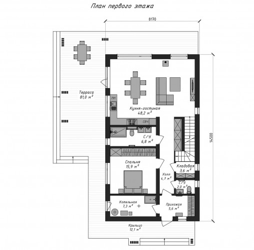 Устройство кровли (либо устройство деревянной стропильной системы под скатную кровлю, либо плоская кровля из монолитных ж/б плит перекрытия), утепления и гидроизоляция